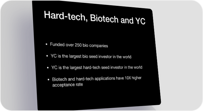 Hard-tech, Biotech and YC • Funded over 250 bio companies • YC is the largest bio seed investor in the world • YC is the largest hard-tech seed investor in the world • Biotech and hard-tech applications have 10X higher acceptance rate