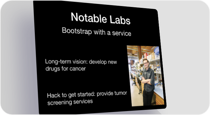 Notable Labs Bootstrap with a service Long-term vision: develop new drugs for cancer Hack to get started: provide tumor screening services