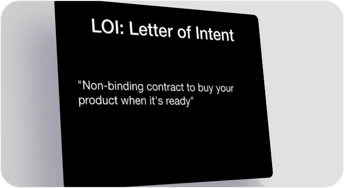 LOI: Letter of Intent "Non-binding contract to buy your product when it's ready"