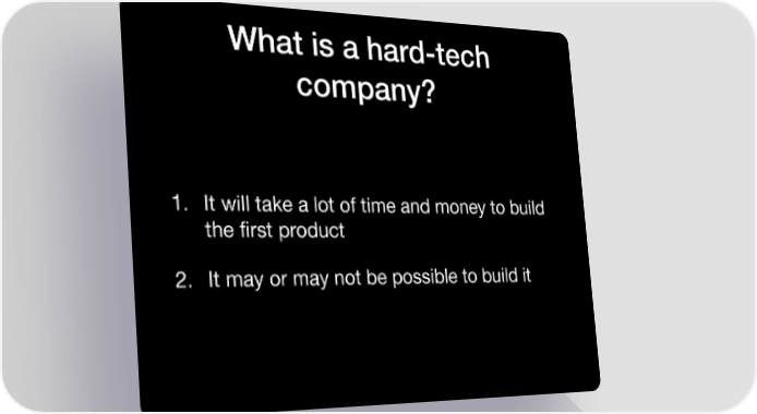 What is a hard-tech company? 1. It will take a lot of time and money to build the first product 2. It may or may not be possible to build it
