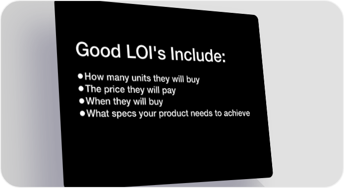 Good LOI's Include: •How many units they will buy •The price they will pay •When they will buy •What specs your product needs to achieve