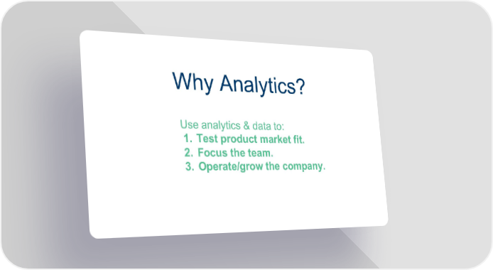 Why Analytics? Use analytics & data to: 1. Test product market fit. 2. Focus the team. 3. Operate/grow the company.