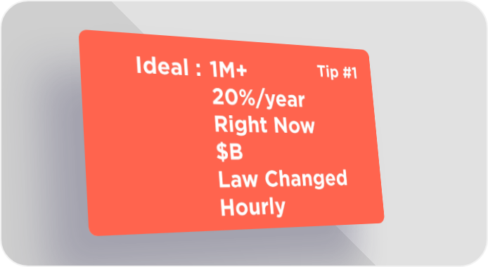 Ideal : 1M+ Tip #1 20%/year Right Now $B Law Changed Hourly How to Evaluate Startup Ideas Page 10 Page 12
