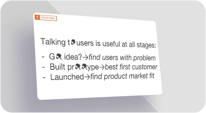 Talking to users is useful at all stages: - Got idea?→find users with problem - Built prototype→best first customer - Launched→find product market fit