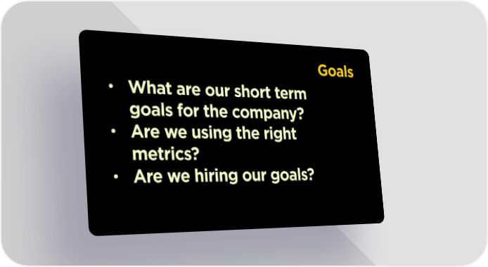 Goals • What are our short term goals for the company? • Are we using the right metrics? • Are we hiring our goals?