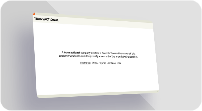 TRANSACTIONAL A transactional company enables a financial transaction on behalf of a customer and collects a fee (usually a percent of the underlying transaction). Examples: Stripe, PayPal, Coinbase, Brex 11