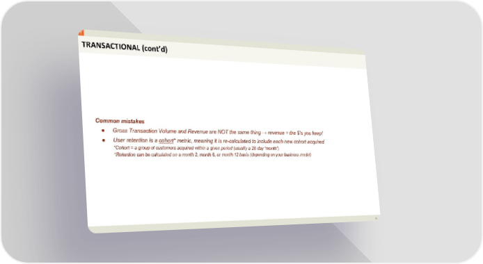 TRANSACTIONAL (cont’d) Common mistakes ● Gross Transaction Volume and Revenue are NOT the same thing → revenue = the $’s you keep! ● User retention is a cohort* metric, meaning it is re-calculated to include each new cohort acquired *Cohort = a group of customers acquired within a given period (usually a 28-day “month”) *Retention can be calculated on a month 2, month 6, or month 12 basis (depending on your business model) 13