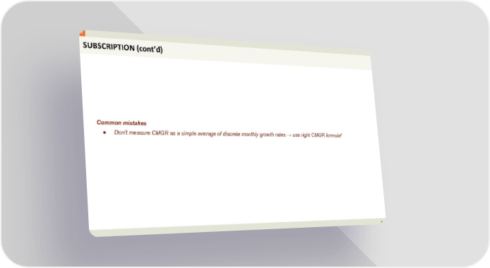 Nine Business Models and the Metrics Investors Want Page 10 Page 12SUBSCRIPTION (cont’d) Common mistakes ● Don’t measure CMGR as a simple average of discrete monthly growth rates → use right CMGR formula! 10