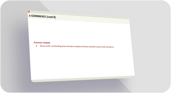 E-COMMERCE (cont’d) Common mistake ● Gross profit: not breaking down all costs included and those excluded in gross profit calculations 19