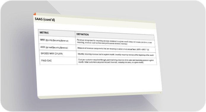 SAAS (cont’d) METRIC DEFINITION MRR (Monthly Recurring Revenue) Revenue recognized for recurring services rendered in a given month (does not include one-time, or non- recurring, revenue such as fees and professional services revenue) ARR (Annual Recurring Revenue) Measure of revenue components that are recurring in nature on an annual basis (ARR = MRR * 12) GROSS MRR CHURN Monthly recurring revenue lost in a given month / monthly recurring revenue at the beginning of the month PAID CAC Cost per customer acquired through paid marketing channels (total sales and marketing spend in a given month / total customers acquired via paid channels, including via sales, in a given month) 6